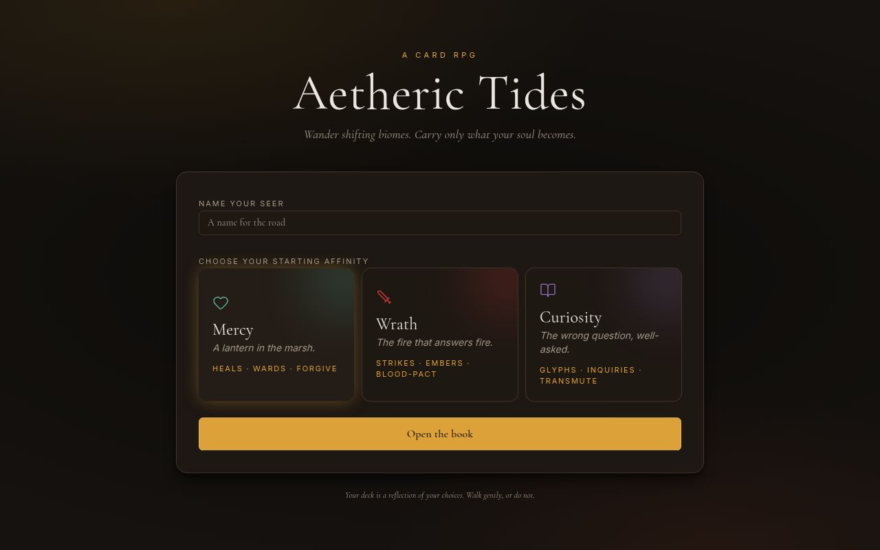 - Manuscript aesthetic. Dark parchment, Cormorant Garamond, no flashing UI, no emojis. Built to be read as much as played.